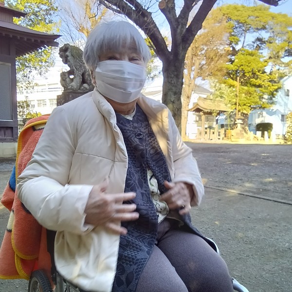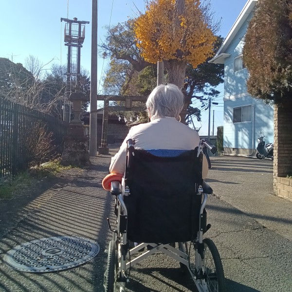 ホーム内はご自分で歩いておられますが、神社まで距離があるので車椅子で向かいます。