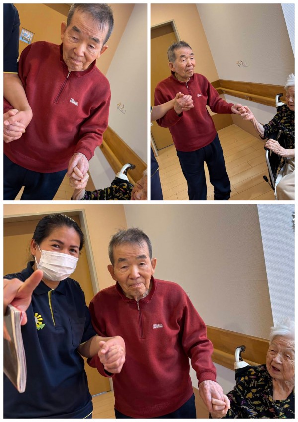職員と手を取り合いゆっくり廊下をお散歩されました(*^^)v途中お声をかけて下さったお母様とご挨拶され更に和やかな雰囲気に!