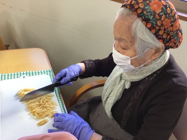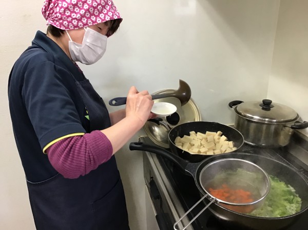 利用者さん達が包丁を持ち、お野菜を切ったり、お肉を丸めたり、、、