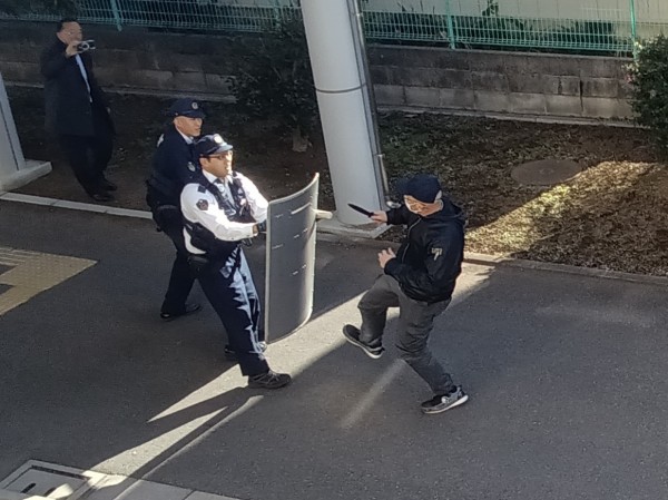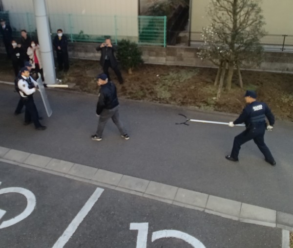 インターンフォンで怒鳴り声をあげ、自動ドアを叩くなどしています。その後、通報を受け駆け付けた朝霞警察署警察官との攻防、