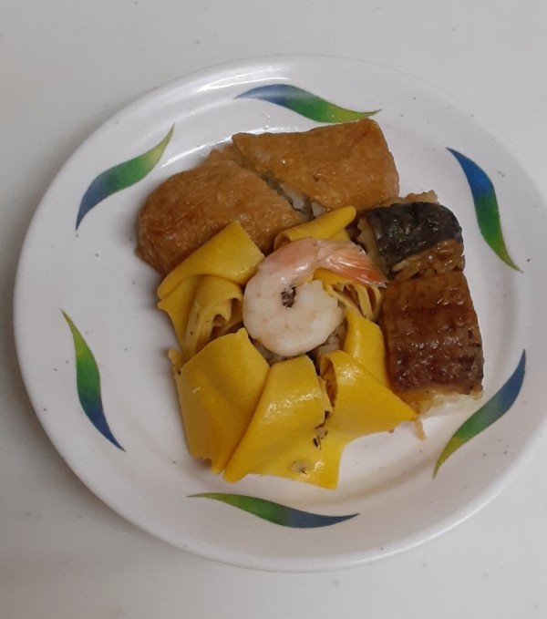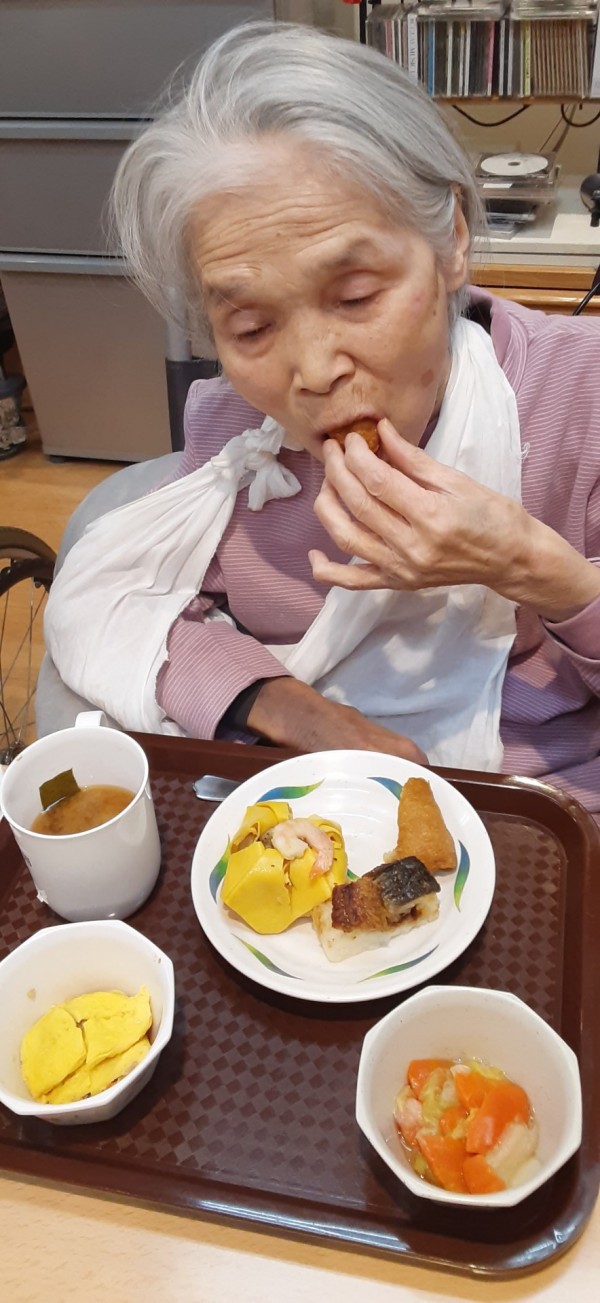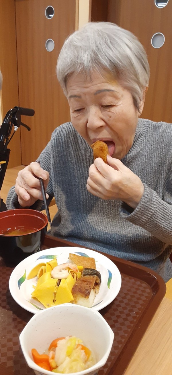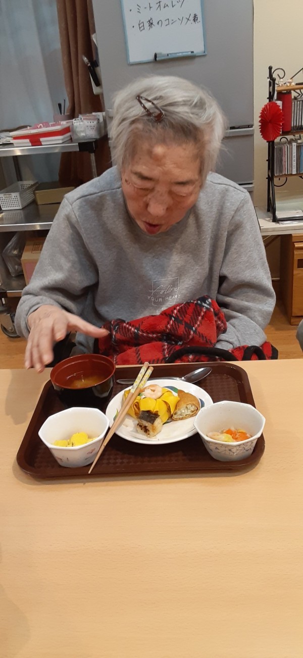 今年のお正月はお寿司3点セットを付けました。茶巾寿司、アナゴの押しずし、お稲荷さん、華やかです。
