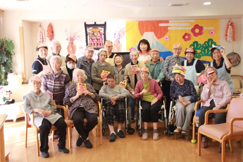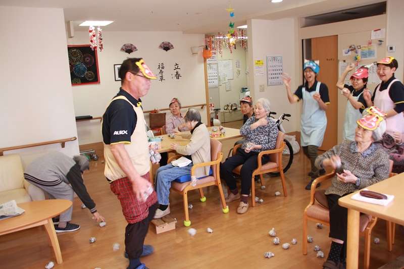 2月2日(土)グループホーム みんなの家 西東京は、1日早い節分の豆?(新聞ボール)まきを行いました。ご利用者の皆様も、赤鬼・青鬼のお面をかぶり、鬼ばー、鬼じー、になって豆まきをしました。普段は見られない皆様の闘志ここぞとばかりに、豆をぶつけていました。体、暖まりましたか?ストレス発散できましたか?2日前に、還暦を迎えた職員に、赤鬼赤パンツをはいてもらい集中攻撃厄払いになりました。この後、投げた豆?を年の数だけ拾ってください。とお願いしたら、「私らの年拾ったら足りなくなっちゃうョ」と大笑いして終わりました。最後に、皆様と一緒に集合写真を撮り、節分の豆の代わりに、甘納豆をおやつに召し上がっていただきました。皆さん、生き生きノビノビのレクでした。来月は、お淑やかに、お雛様コスプレと、ひな祭りの食事会を予定しております。また楽しい様子をアップしたいと思います。