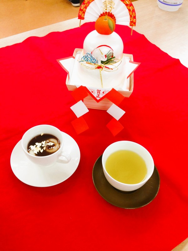 お汁粉が完成しましたー!鏡餅を添え、金粉も掛けてみました。とっても美味しかったとの感想も頂きました♪