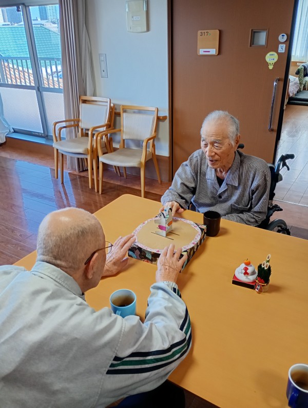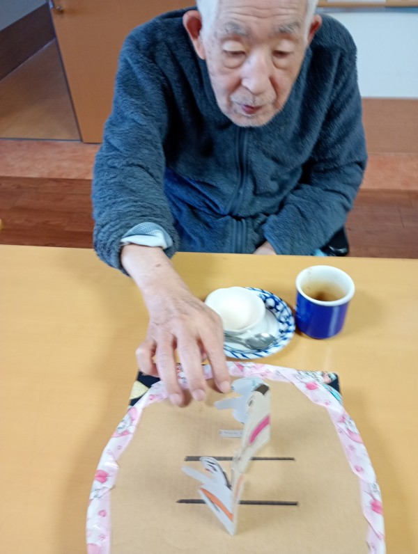 午後のお茶の時間にトントン相撲と福笑い行いました。