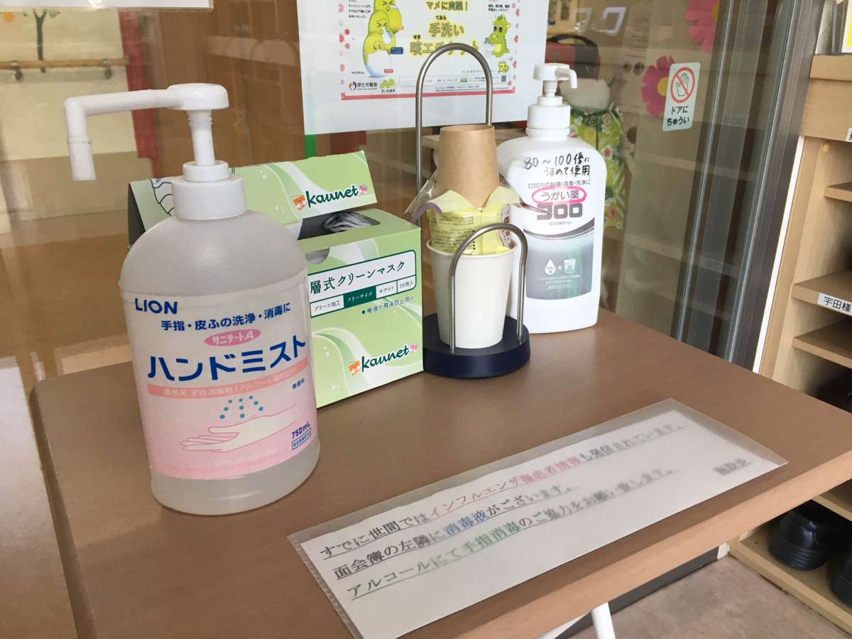 誰でも分かり易く設置場所を別個で個別化し、インフルエンザの注意喚起を促すようにして下さりました。そして何より面会者やお客様にはアルコールにて手指消毒のご協力をお願いしておりますが、うがい薬の『ヨード液』が身体に悪影響を与える方もいらっしゃいますので、その際はご自宅からマスクをしてから施設へ伺って頂いております。