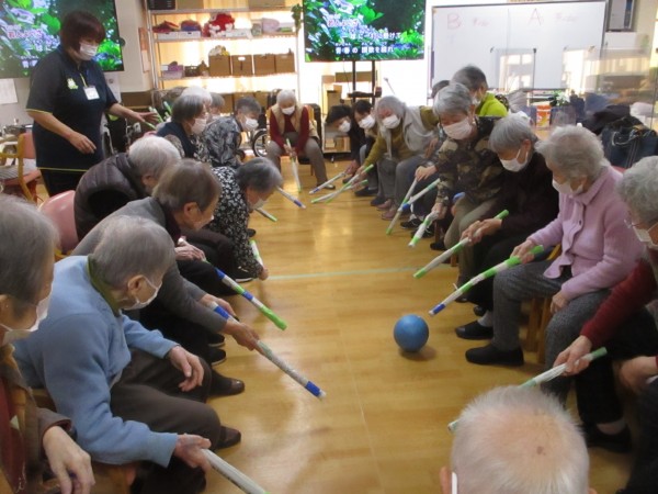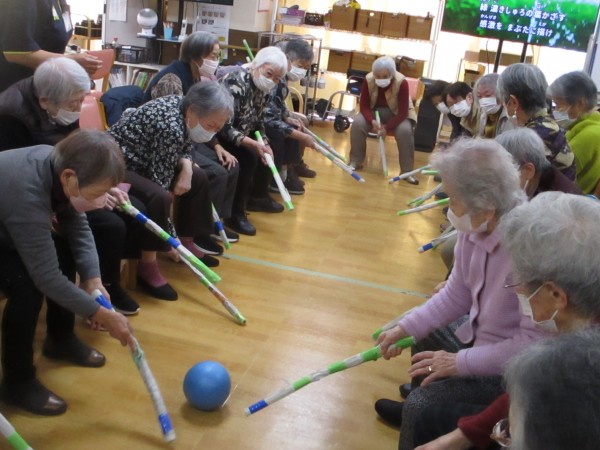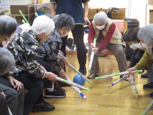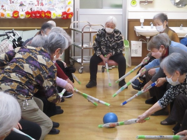 座位のまま行える棒サッカーは、腕や肩をしっかり動かしながら、集中力や反応力、チームワークも養えるレクリエーションです。とても盛り上がり、笑顔あふれる時間となりました♪