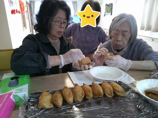 本日のお昼はちらし寿司を作り、俵型に職員が形を整え、皆さんにはお揚げにつめて頂きました!