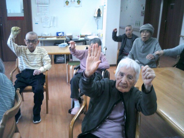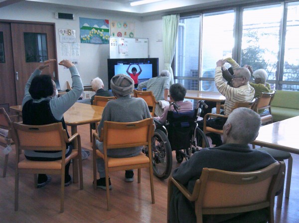 リモート体操(いきいきリズム体操)を行っているご様子です( ^ω^)・・・ ご家族様が来られ一緒に参加されています。