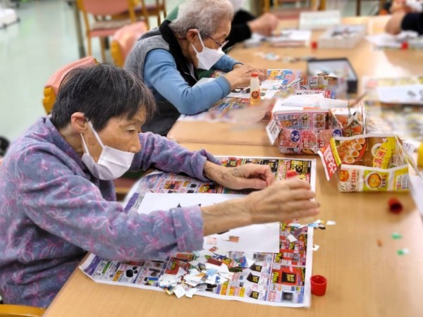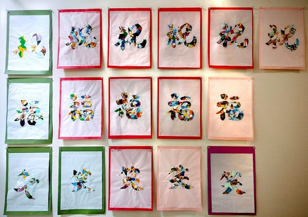 1つ選んでいただき、文字部分に色とりどりで質も様々な紙を貼り付けていただきました。