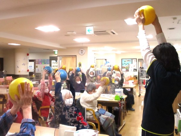 本日午後のレクリエーションは【介護予防運動】いつもより利用者様は少し少なめでしたが、そんなことを感じさせないほど、にぎやかで楽しい時間となりました。というのも今日は、**元気な「掛け声隊」**の皆様が大活躍!体を大きく動かす運動は少し難しく、運動への参加が限られてしまう方々ですが、その分、声援でしっかりと皆様を応援してくださいました。