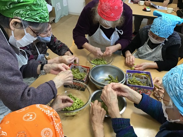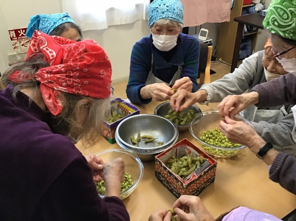 最初に茹でた枝豆の薄皮を取っていただきます。