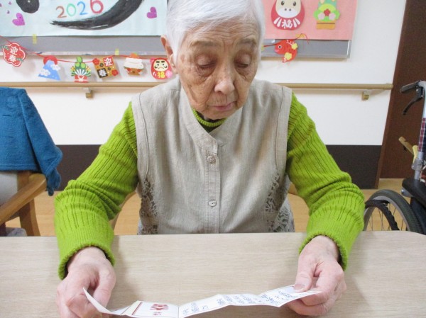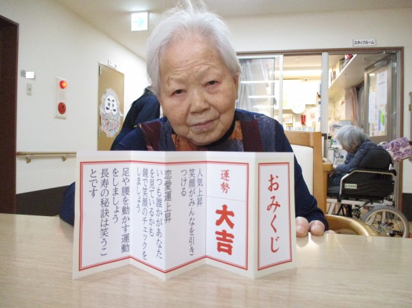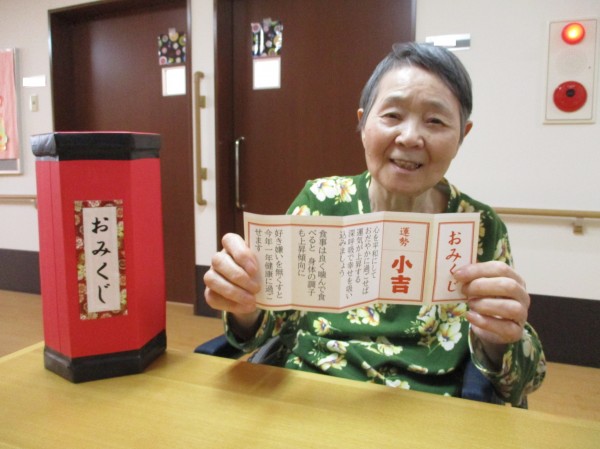 今回のブログは1階の皆様にお正月レクで福笑いやおみくじを引いていただいた際のご様子です♪