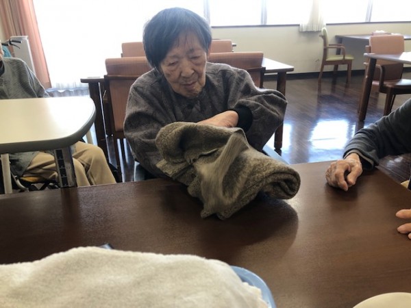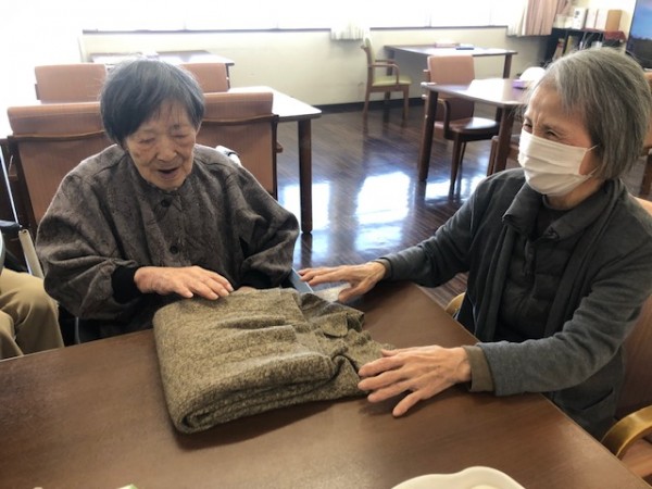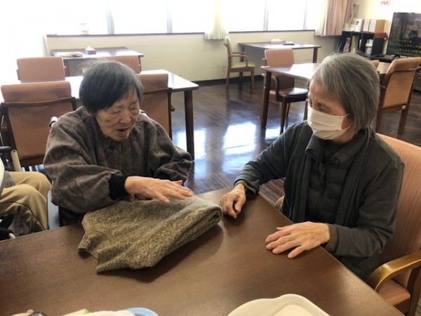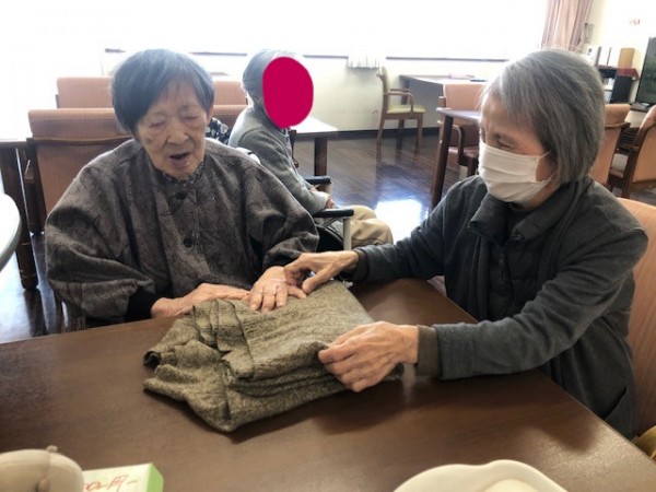 いつも職員のお手伝いをしてくださるのですが、今回はいつもより分厚いセーターなんだかうまくできないなと思っていたら隣にいたH様がやさしくそれはやさしく教えてくれました。これはこうしてやるとね、いいですよ~