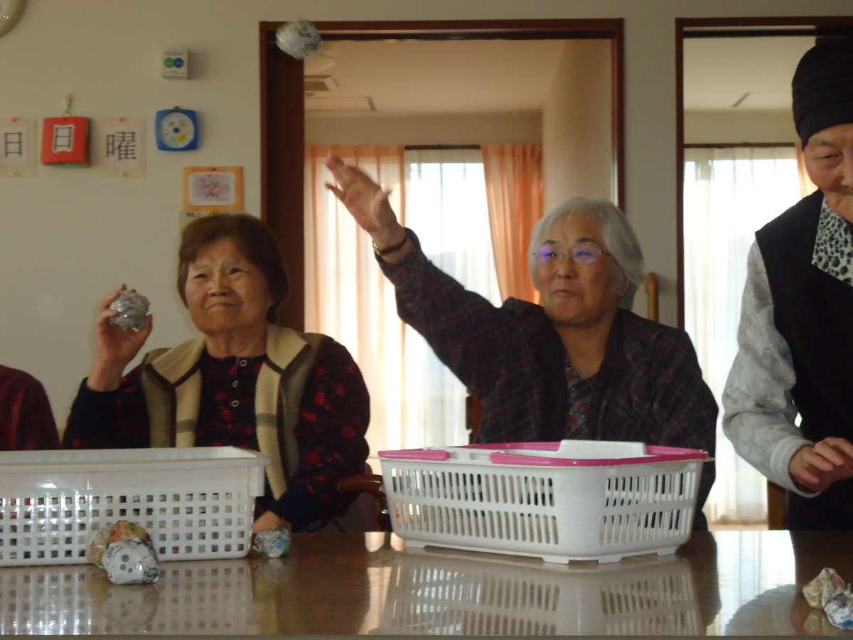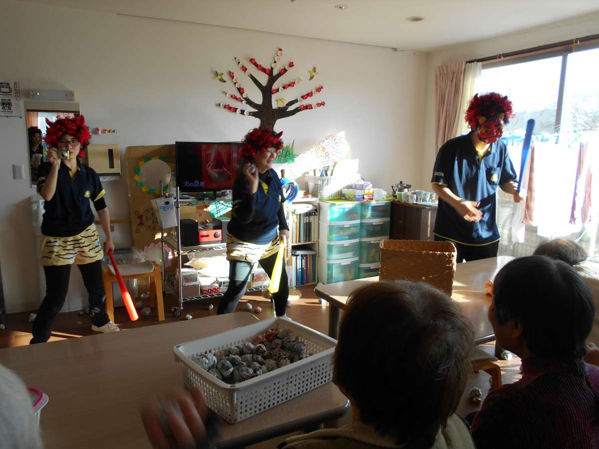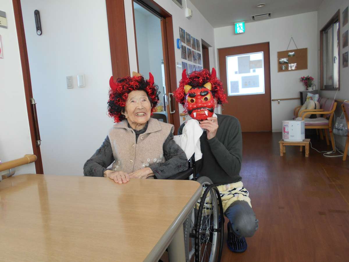 鬼のスタッフとご利用者様とご家族も一緒に紙で作った豆を投げ合いました!