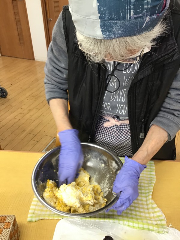 カボチャも混ぜ込んで、しっかり捏ねましょう♪(^^♪