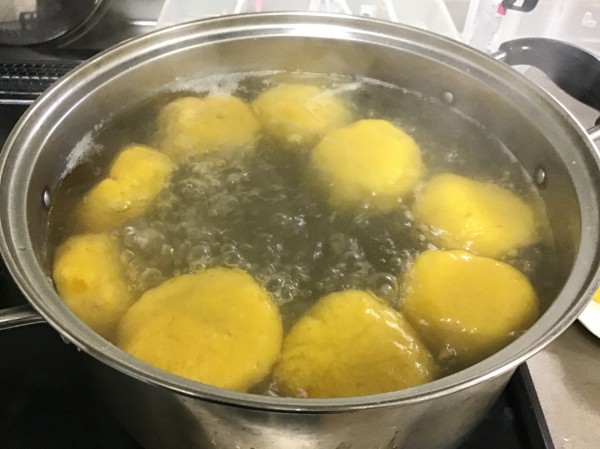 沸騰したお湯の中に、カボチャ白玉を入れていきます。
