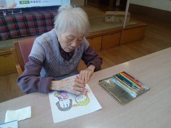 季節に合ったイラストのぬり絵をしていただいてます(^^♪