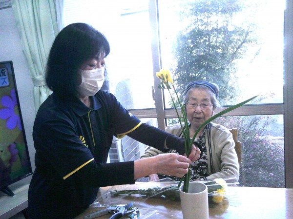 今日はご家族様がお花の差し入れがありました。 菜の花やすいせんや菊の黄色いお花でまとめてありました。 心が落ち着くようにとのことでした!!