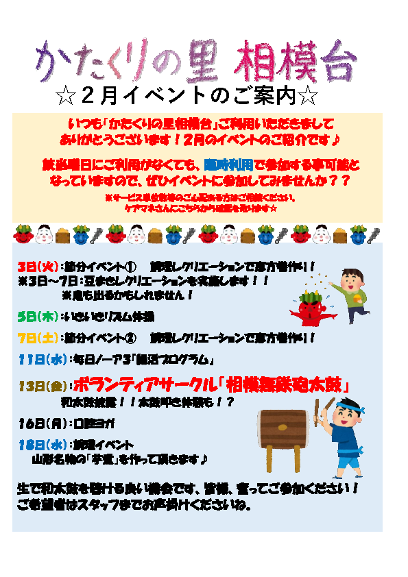 2月のデイサービスかたくりの里相模台のイベントお知らせです!