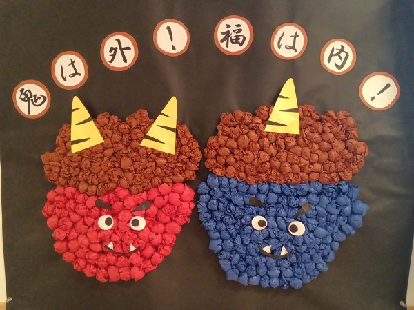 お花紙を丸めて赤鬼、青鬼を作成しました!