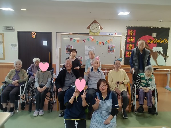 3名の男性ご利用者様が目出度くお誕生日を迎えられ、みんなに祝福され特製のおやつをご賞味いただきた後、3名の主役を囲んで記念撮影を行いました。