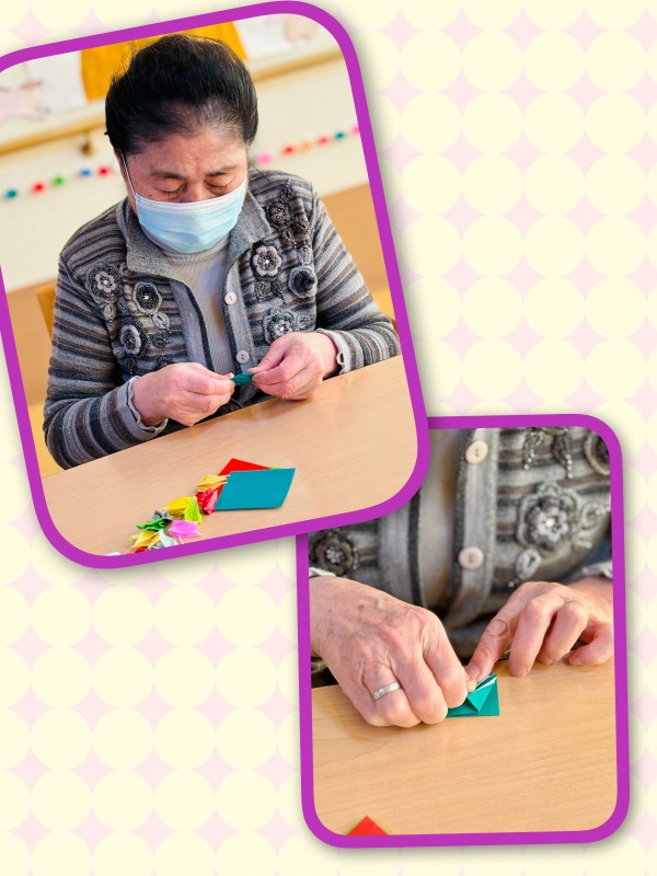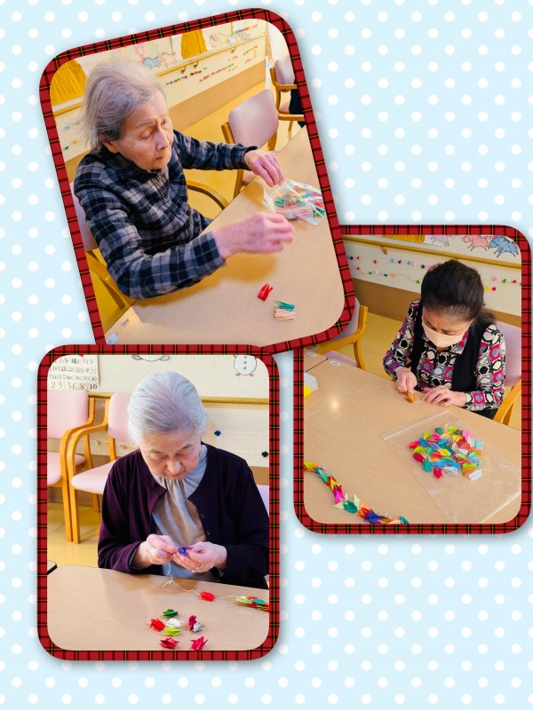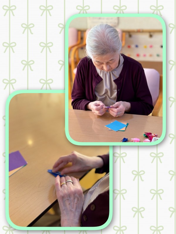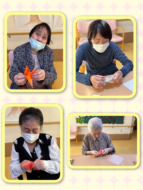 ぬり絵やパズルにも飽きて「何かやる事ない?」と仰る入居者様に、「折り紙で鶴でも折りませんか?」とお声かけをしたのが事の始まりでした!