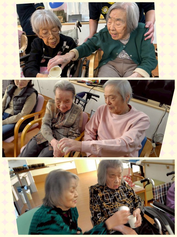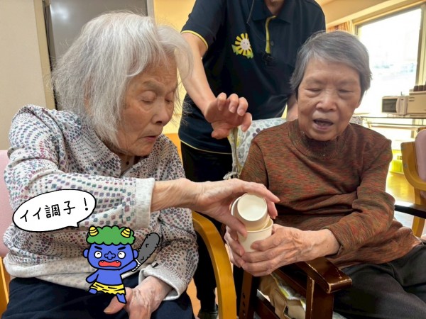 お父様、紙コップはまだ空っぽです。これから行なうゲームは、小さな豆を紙コップで送る、節分豆リレー!