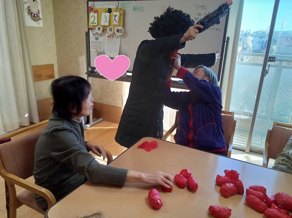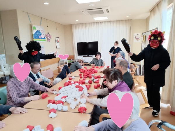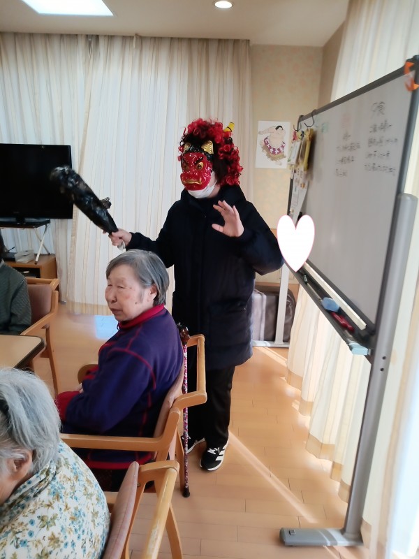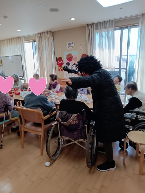 なまはげのような姿に皆さんは驚きつつも笑顔で楽しまれていましたが遊びに来ていたホーム長のお子さんは迫力ある鬼に「やだよ~怖いよ~」と思わず涙するい一幕もありました。小さい子には、なかなか迫力のある鬼だったようです(泣)