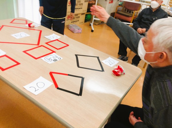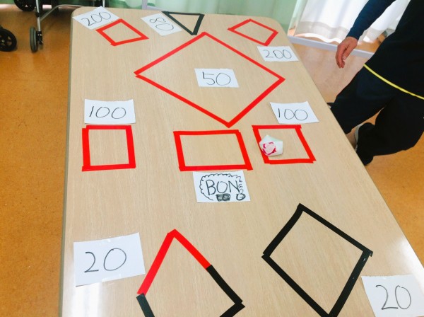 今回はテーブル上にテープを貼り、その中に入れば点数が入るルールになります