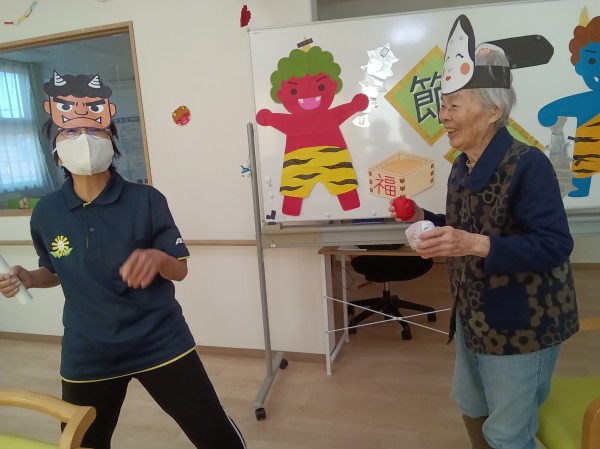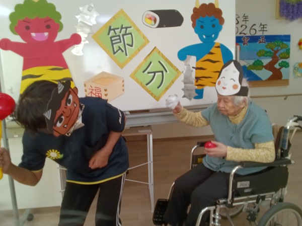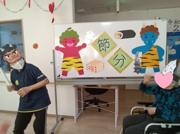 2月と言えば節分。 無病息災を願う伝統行事、みんなの家たかしなでも「鬼は外!福は内!」と掛け声をかけ鬼に扮した職員を追い払いました!