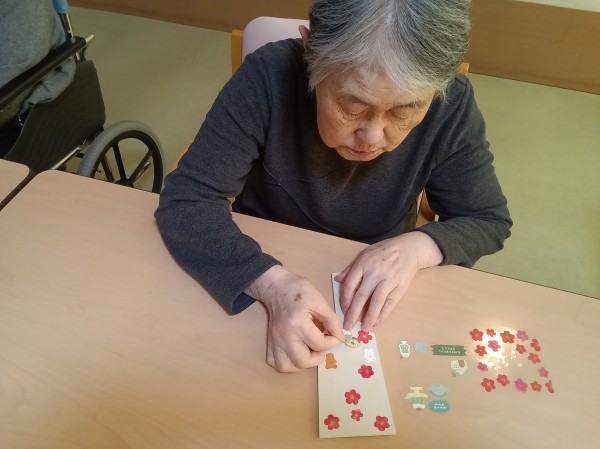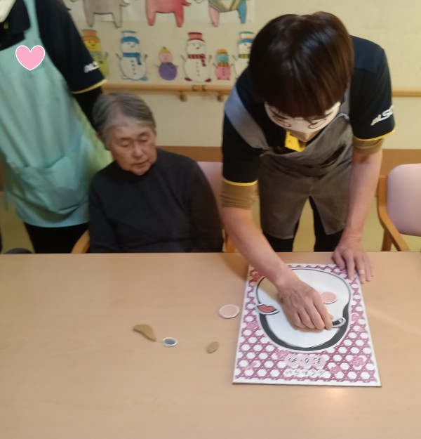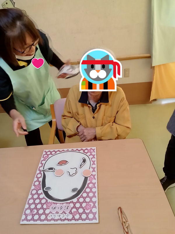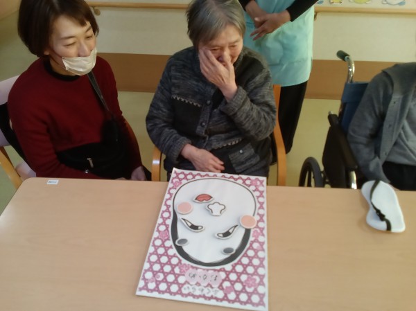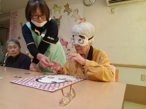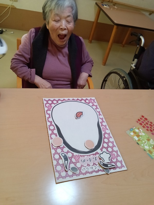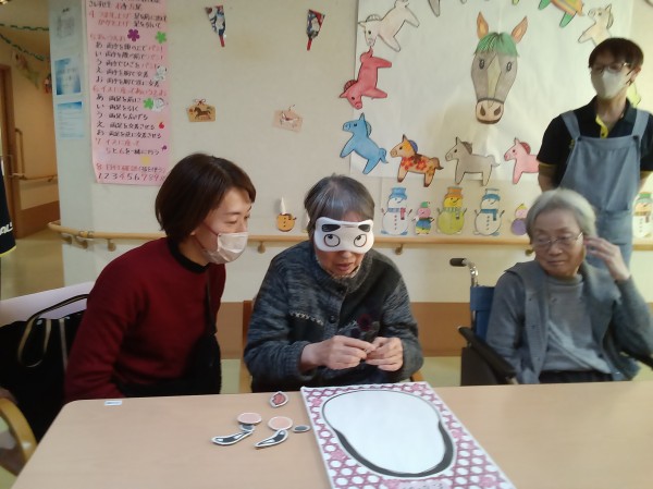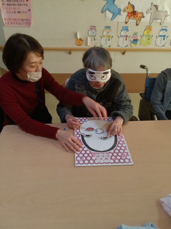 1月の新年会で伝統的なお正月遊びの「福笑い」を入居者様と一緒に楽しみました。