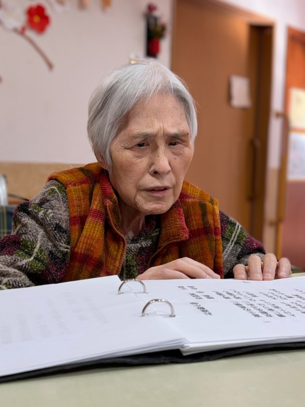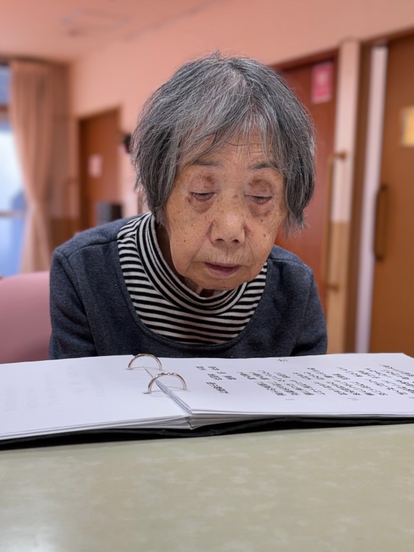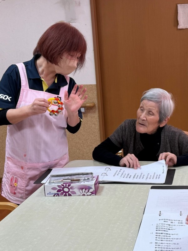 テーブルを囲み、歌詞カードを手に、職員が鈴でリズムを取りながら、一曲ずつ、ゆっくりと歌っていきます。