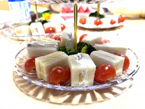 ・チーズのサンドイッチ、バナナとクリームのサンドイッチ、ブロッコリー、ミニトマト