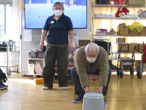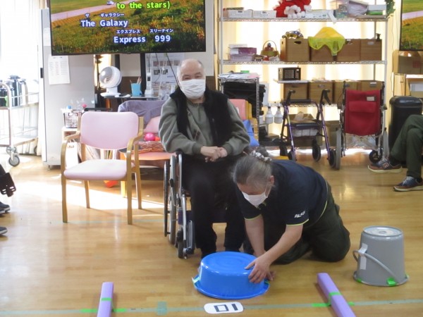 今月の【何が出るかな?わくわくゲーム】の時間は、ちょっと変わったカーリングに挑戦しました!その名も“バケツとタライでカーリング”