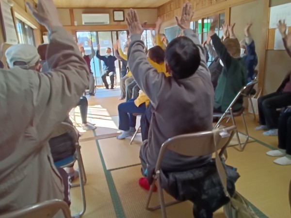まずは、グループホームの担当者から。「いい湯だな」の曲に合わせてのリズム体操。