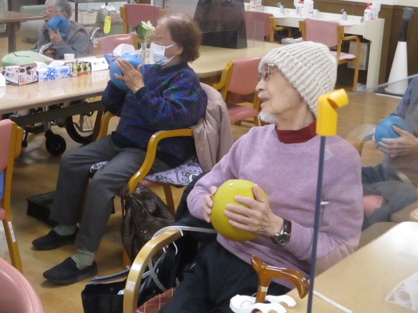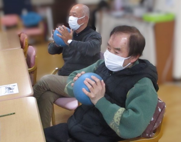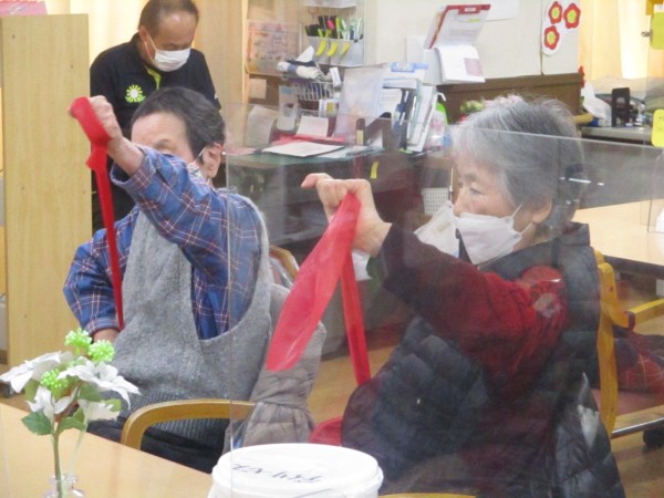 本日は、春のお出かけに備えた体づくりとして、ボールと赤のセラバンドを使った介護予防運動を行いました。
