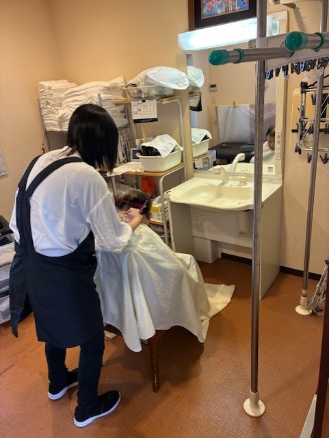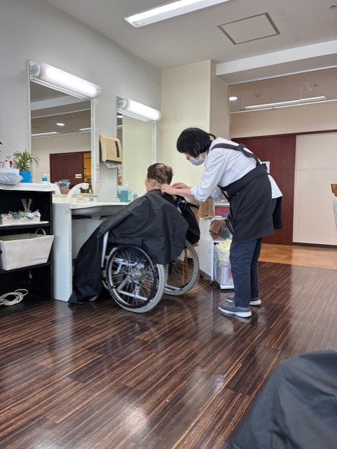 いつもおしゃべりが大好きでみんなとフロアでも大きな声ではなしていると一目でわかるお話好き!今回も担当の美容師さんがやさしく声をかけてくれるおかげもあって話題が尽きません(笑)でも普段職員とゆっくり時間をかけて話すことが少ないからFさんにとってはとても好きな時間になってるに違いないです!