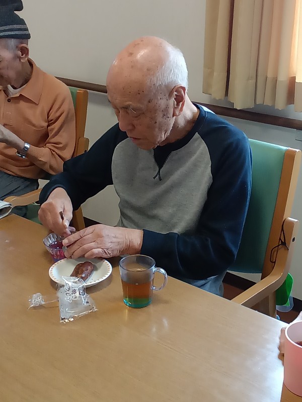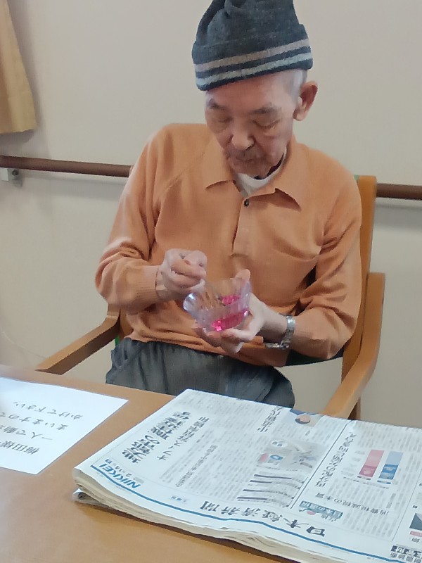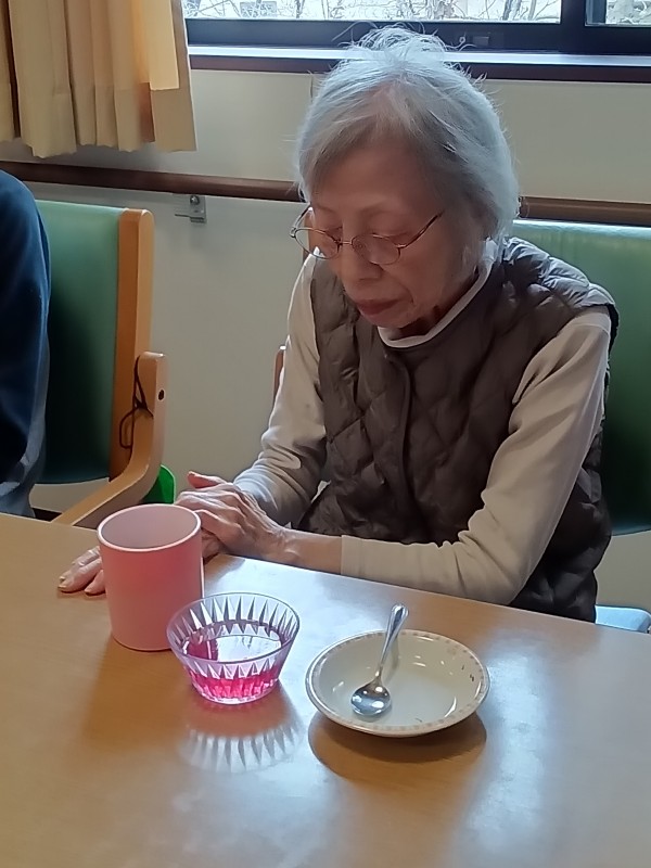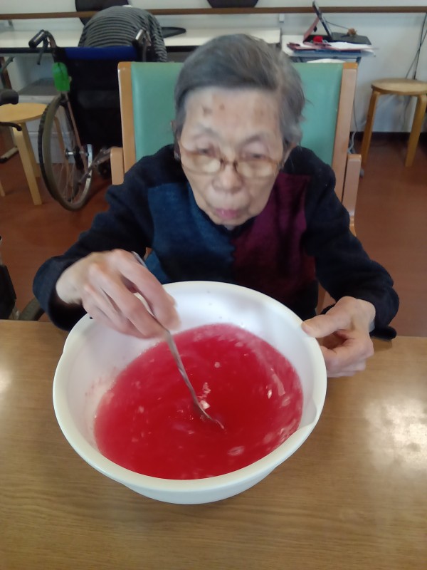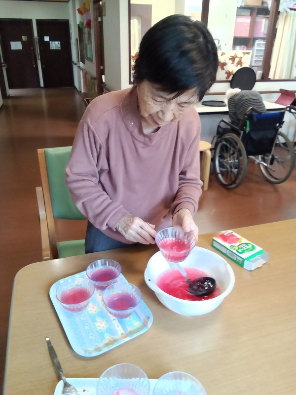 この日のスイ-ツは手作りゼリーで、入居者様に作っていただきました
