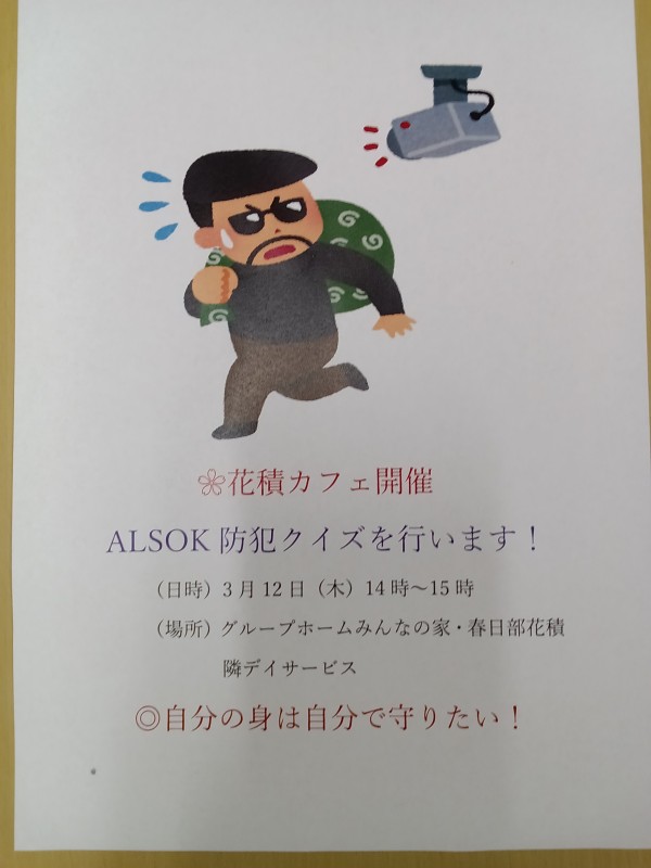 花積カフェ開催いたします。今回は、ALSOK防犯クイズを行います。