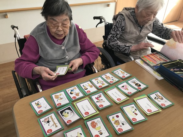 カルタを使って絵を合わせる言葉遊び~ この方にによると、詠まれた文字を探すより難しいらしい(*_*; じっくりと脳トレ中~