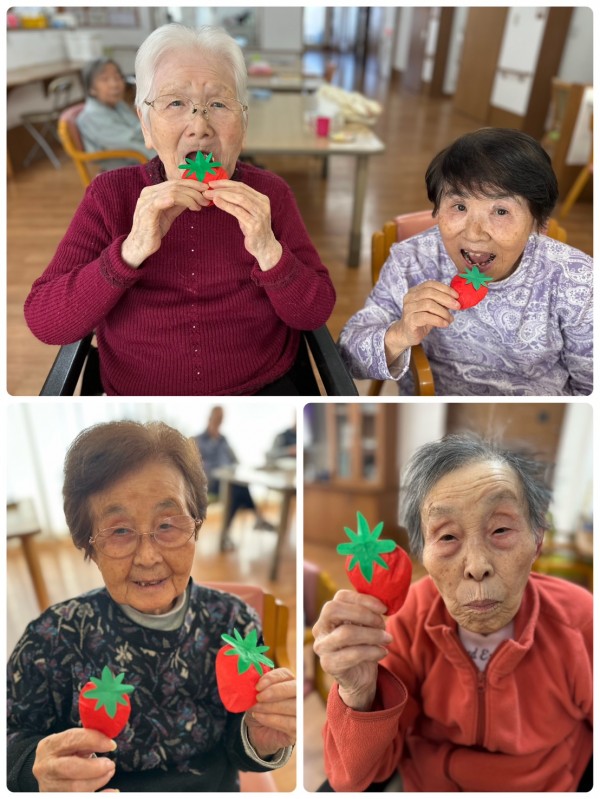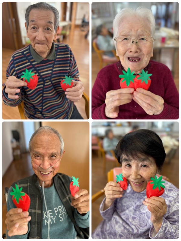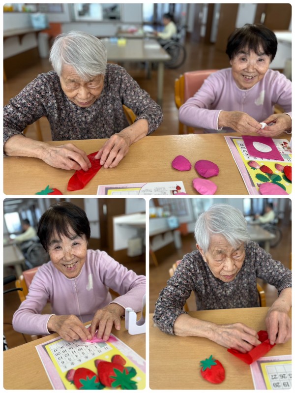 型紙を使い色画用紙から『苺や葉っぱ』を切り出したり、台紙にティッシュをのせてお花紙でくるみ、立体的にイチゴを作って頂きました☆