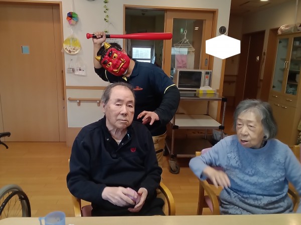 職員が鬼になります。痩せている鬼よりふっくらとした鬼の方が盛り上がります・・・さて鬼になりきって盛り上げていきます。