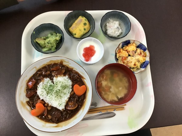 ハヤシライスでは、バレンタイン仕様ということで、にんじんやご飯の盛り付けをハート型にしました!