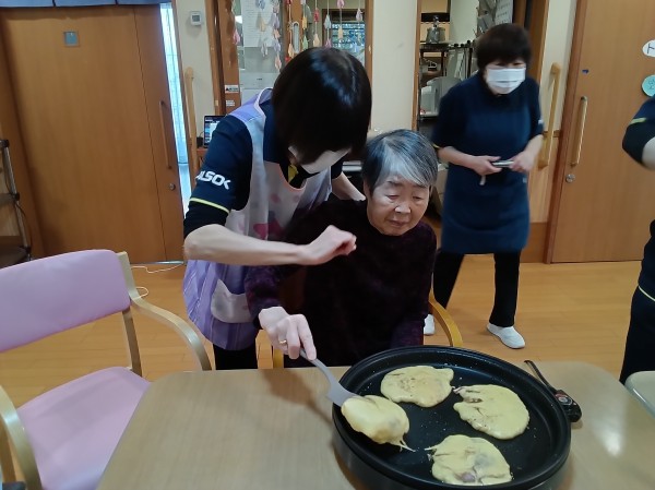 ホットプレートを囲み、数名のご利用者様に「ひっくり返し」をお願いしたところ、「任せて!」とお見事な手つき♪