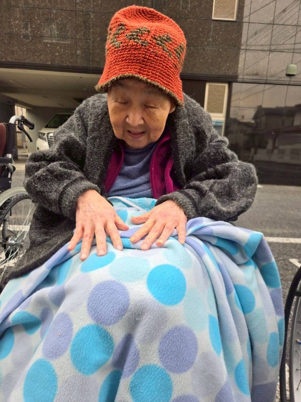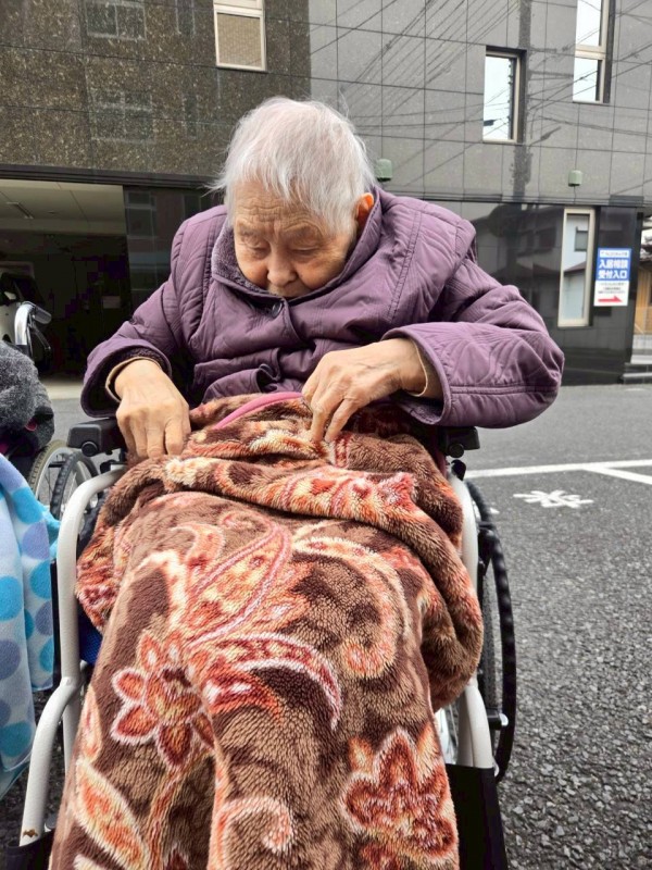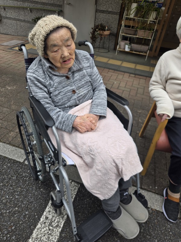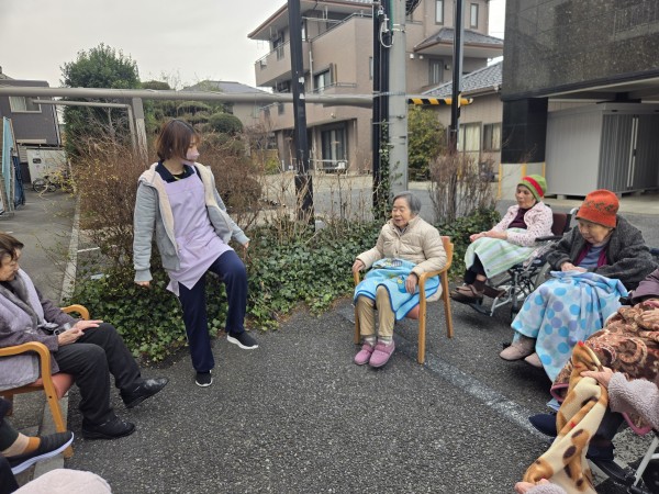 先日の晴れて暖かい日に、皆様で外気浴がてらおやつを召し上がり,元気に体操をしました。