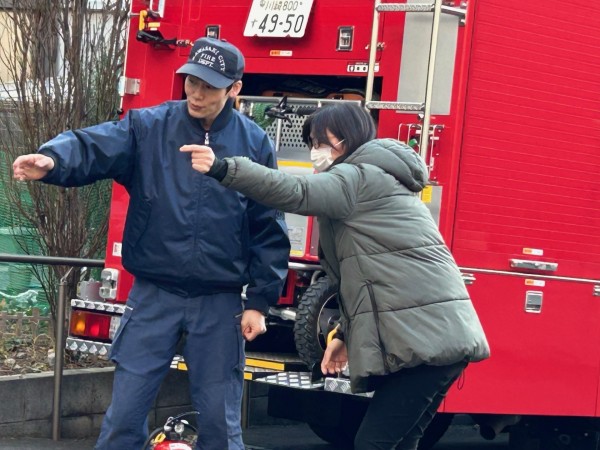 当日は4名の隊員の皆様にお越しいただき、消防車も出動していただいての大変貴重な訓練に、みなさま大興奮……。