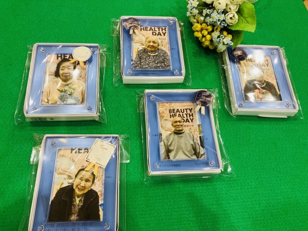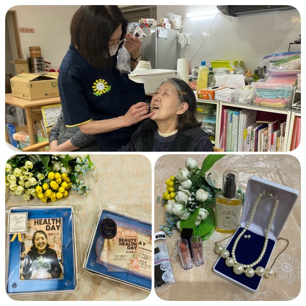 お顔のスキンケアにハンドマッサージお肌ツルツル潤ったところで口紅とアクセサリーを付けてちょっとおめかし…写真をパシャリ!!せっかくなので額に入れてプレゼントさせていただきました。