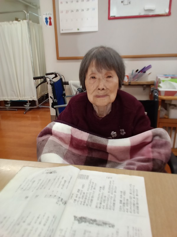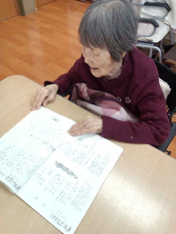 こちらの方はお歌がお好きで、歌の時間ではない時でも、いつも口ずさんでいらっしゃるんです。そんな時には歌集をお渡しして、歌を楽しんでもらっています。どんな方でも好きなことがありますから、みんなの家・府中ではその方が好きなことを出来るように機会をご提供し、生活がより生き生きとしたものとなるように心掛けています。