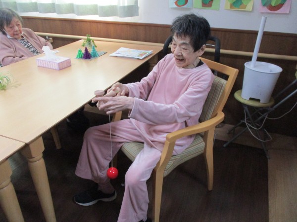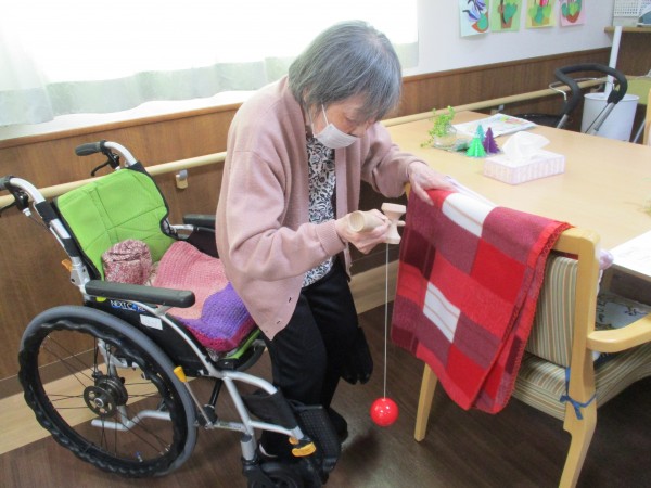 「けん玉なんて久しぶりだからできるかしら~」と自信なさげにお話しされるご利用者様でしたが、何回か挑戦するとコツをつかんできたようで、慣れた手つきでひょいっと皿に玉を乗せておられました(^^♪