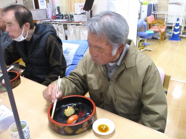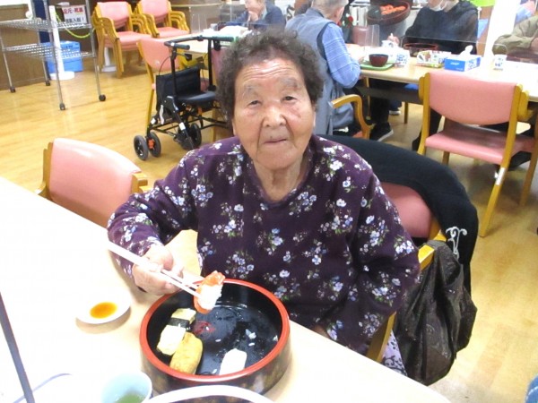 いつも職人としての心配りと利用者様への細やかなご配慮です。飲み込みに配慮したネタの選定と大きさへの配慮。シャリとのバランス、握りを半分にして提供してくださるなど、一口で無理なく召し上がれるよう、丁寧に工夫してくださいました。見た目だけでなく、「安全に、美味しく」食べていただくための心遣いに、職員一同感動です。